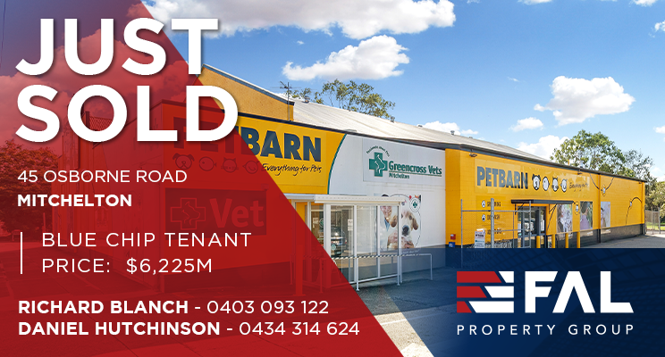 FAL Property Group is pleased to announce the successful sale of Petbarn & Greencross Vet at 45 Osborne Road, Mitchelton. The property was brought to market by FAL Property Group agents Richard Blanch and Daniel Hutchinson, in conjunction with Ray White Commercial Broadbeach agent Thomas Clark, on behalf of two private investors. The blue chip asset transacted at auction for $6.225M which reflects a...