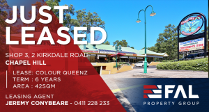 FAL Property Group is pleased to announce the successful 6 year lease of Shop 3, 2 Kirkdale Road, Chapel Hill For more information, please contact Jeremy